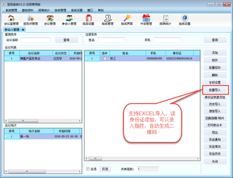 支持身份證簽到,二維碼簽到,ID,IC卡簽到,指紋簽到,查看簽到人員信息,未簽到人員信息,導出數據,